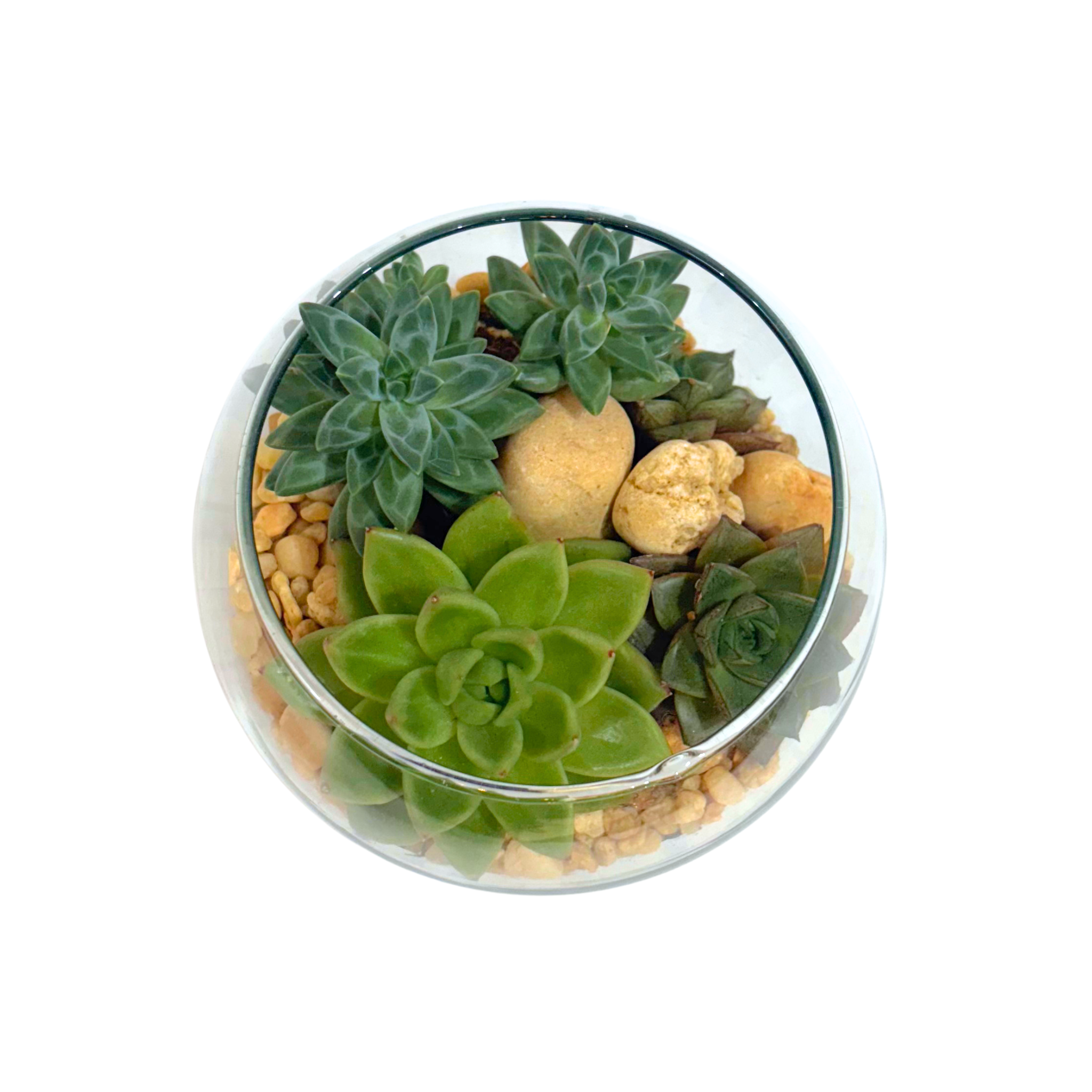 Suculentas variadas e acabamentos (terra, pedrinhas, areia). Tudo feito a mão, único e cheio de carinho